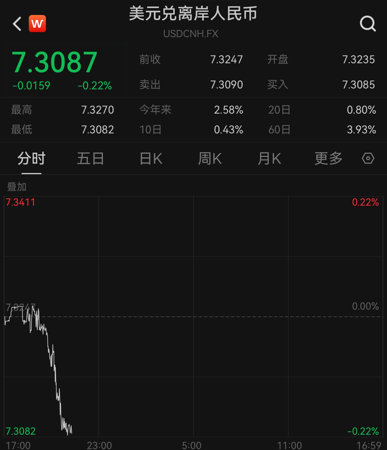 离岸市场上,更多反映国际投资者预期的离岸人民币对美元汇率在美联储公布议息决议后快速走低,一度跌至7.3271,刷新去年11月初以来的一年多新低,随后收复部分失地。