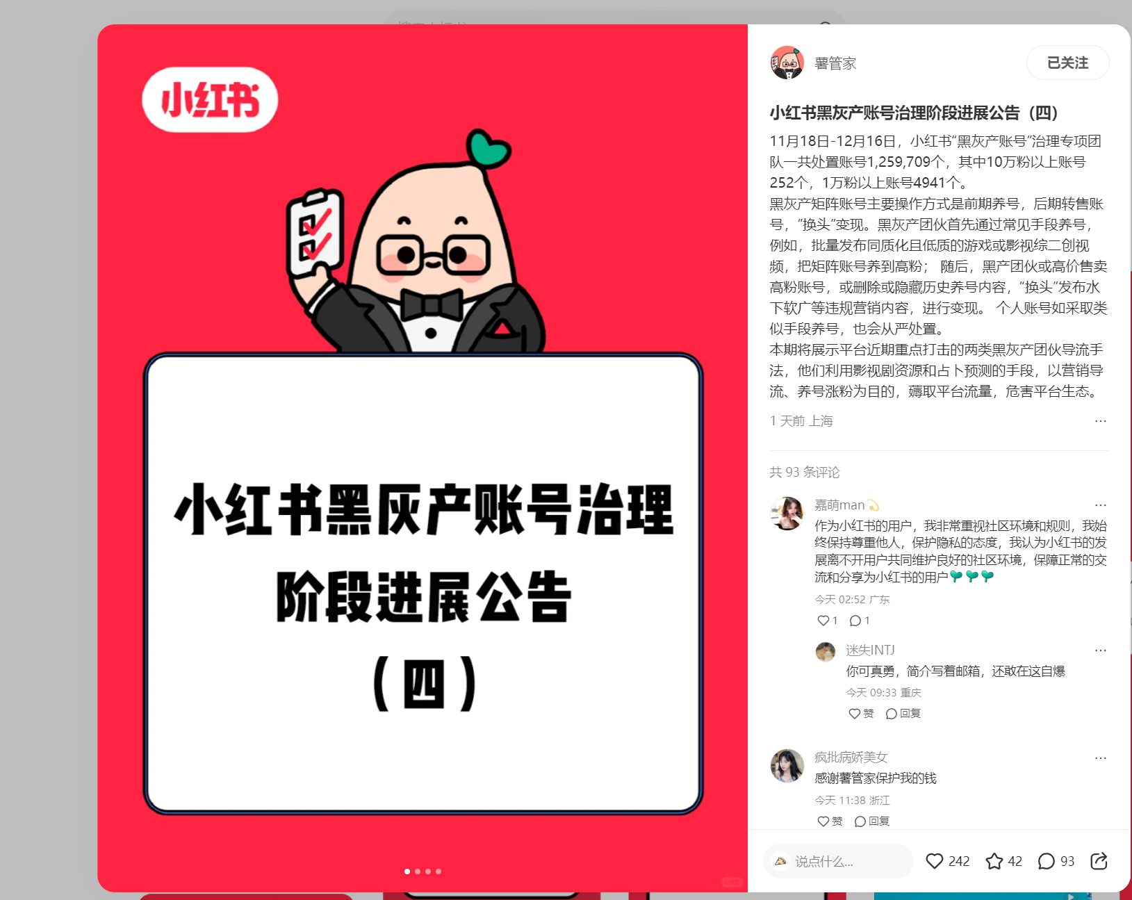 记者同时注意到,小红书官方账号“薯管家”近日发布了“黑灰产账号”治理阶段进展公告。其中提到,11月18日-12月16日,小红书“黑灰产账号”治理专项团队一共处置账号1259709个,其中10万粉以上账号252个,1万粉以上账号4941个。