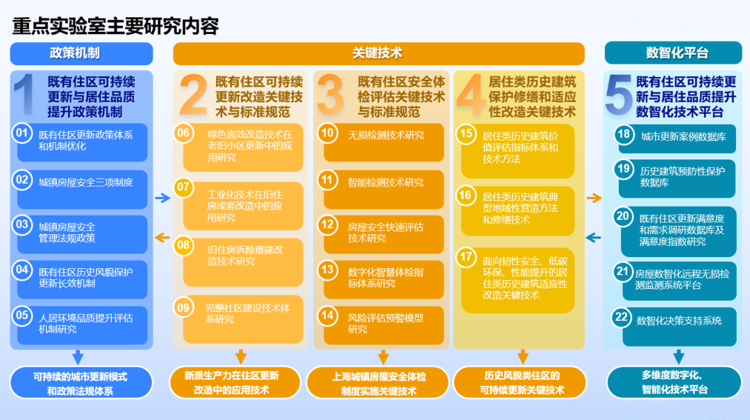 上海市住房和城乡建设管理委员会既有住区可持续更新与居住品质提升重点实验室(以下简称“实验室”)由上海市房地产科学研究院牵头,联合上海大学上海城市更新与可持续发展研究院、上海建设管理职业技术学院、上海房屋质量检测站有限公司共同创建。负责人及首席专家由上海市房地产科学研究院党委书记、院长严荣担任。把牢人民城市根本属性,聚焦本市既有住区可持续更新与加快补齐城市安全韧性短板,打造宜居、韧性、智慧城市,实验室将开展政策机制、关键技术、标准规范和数智化技术应用等方面的科学研究,为解决既有住区在可持续更新、居住品质提升等方面的现实问题提供技术支持与决策支撑。