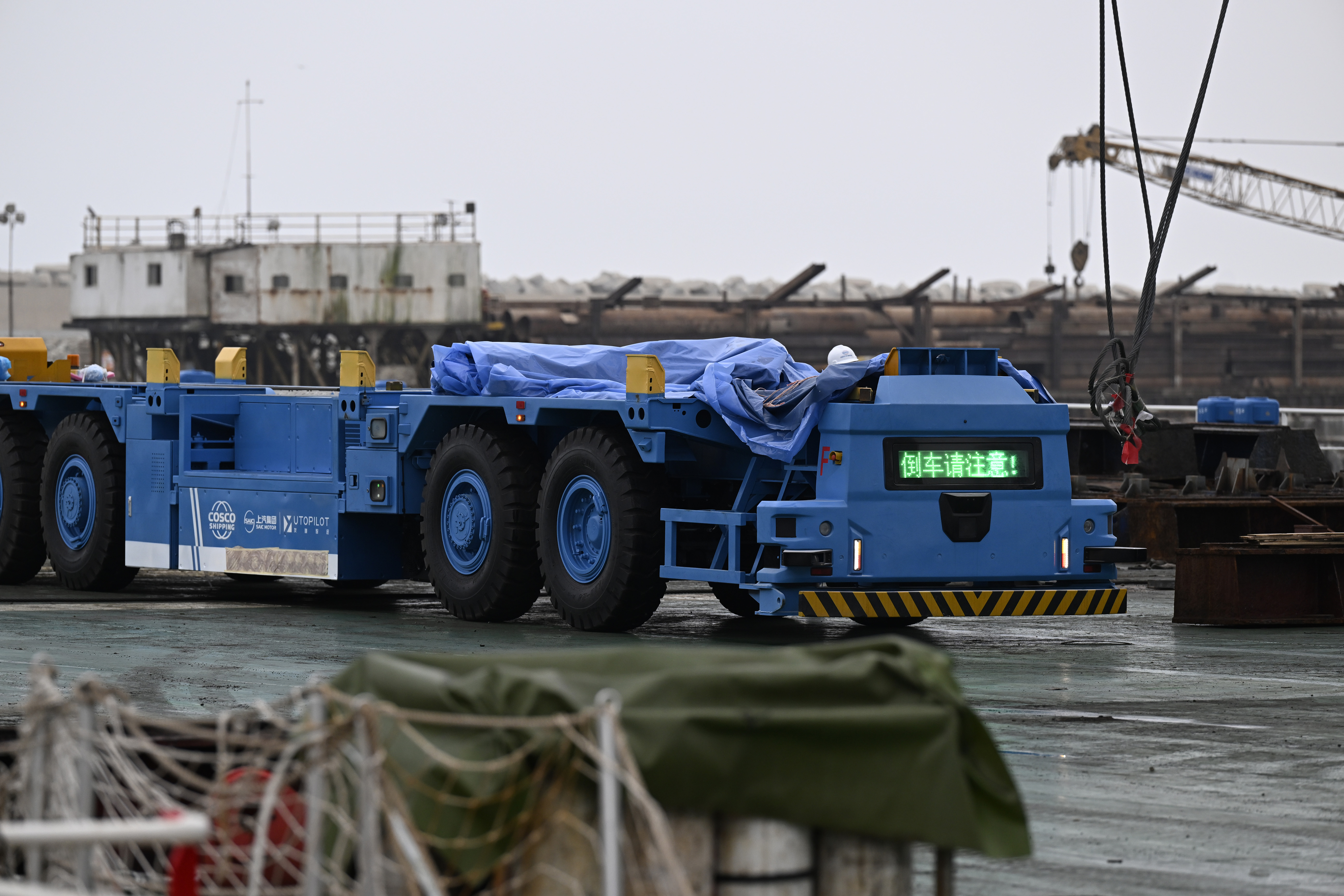 在码头操作区,具备自动驾驶技术的电动集装箱卡车行驶安静轻巧、路线精准。这些无人车将实现全自动运行,提高集装箱作业效率。