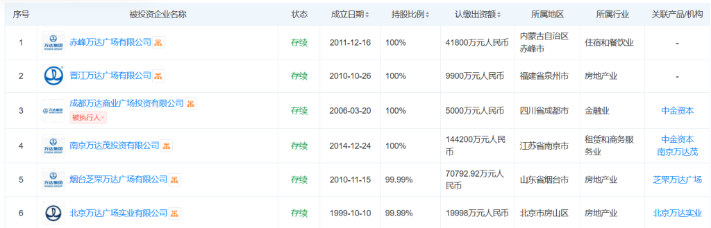 除了前述两个项目公司之外,此前新华保险已陆续接手成都万达商业广场投资有限公司、南京万达茂投资有限公司、烟台芝罘万达广场有限公司和北京万达广场实业有限公司。