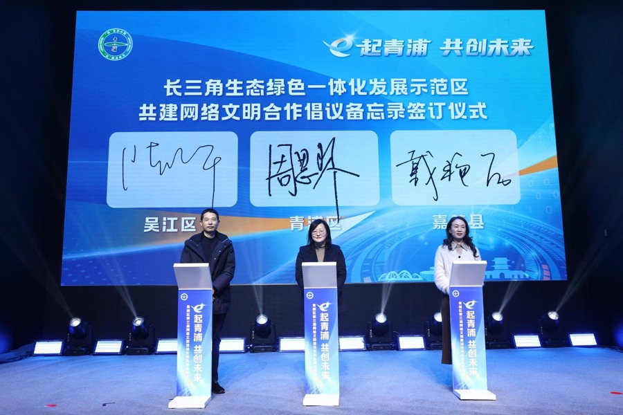 12月20日下午,青浦区举办“e起青浦 共创未来”青浦区第三届网络文明建设优秀品牌发布活动。会上,上海市青浦区与江苏省苏州市吴江区、浙江省嘉兴市嘉善县签订《长三角生态绿色一体化发展示范区共建网络文明合作倡议备忘录》,今后示范区三地将在网络文明合作共商、正面宣传话题共推、网络生态协同共治、网络安全防线共筑、网络执法机制共建、网络平台行业共律等领域加强交流与合作,协同各方资源,打造长三角一体化网络文明发展新样本。