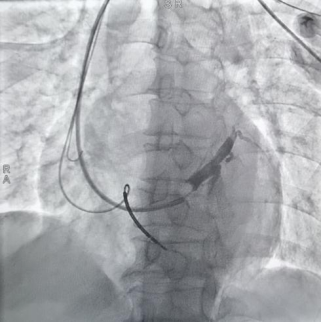 经过周密的术前准备,张亮带领团队在心导管室为患者实施局麻下手术,穿刺左侧锁骨下静脉后,经左室长鞘中置入Amplatz导管找到冠状窦;随后团队使用造影球囊进行冠状静脉造影,经仔细评估确定靶向左室静脉支后,通过精准的导丝操作置入电极,最终顺利完成手术。