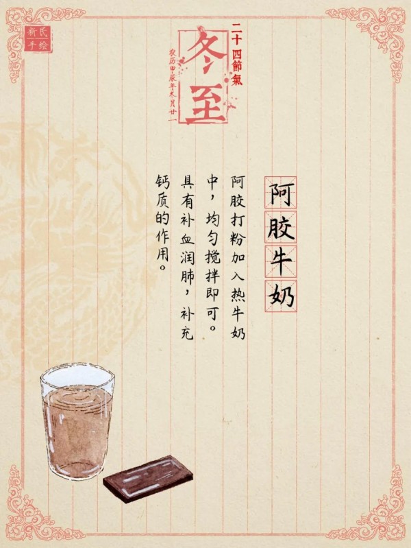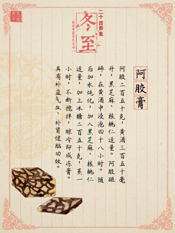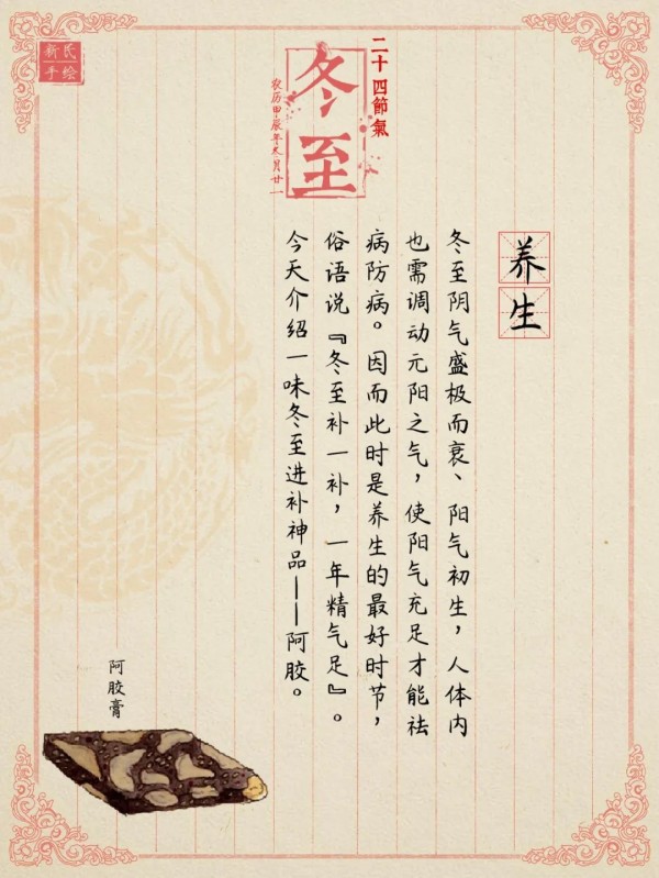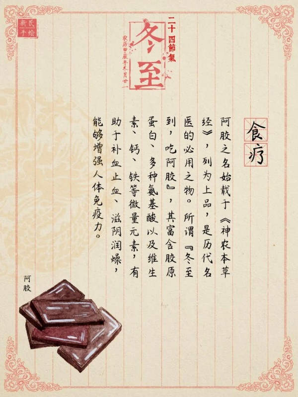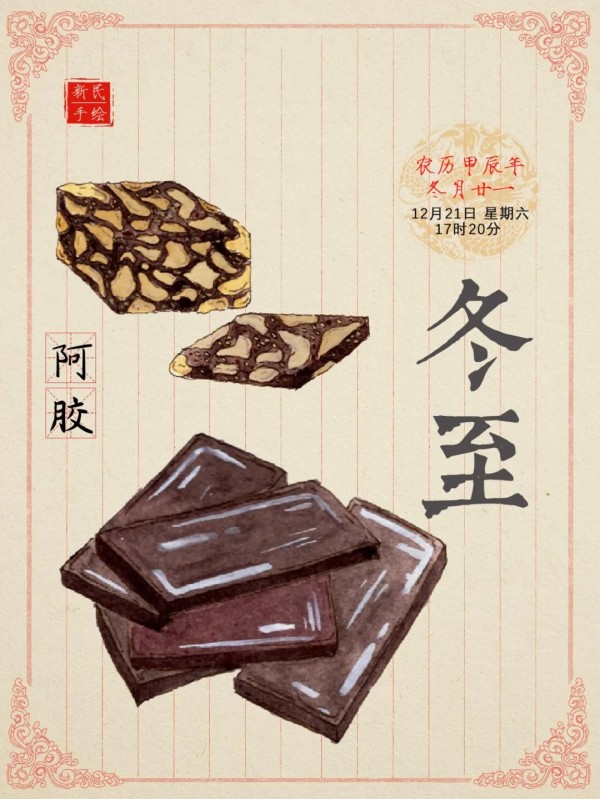 冬至阴气盛极而衰、阳气初生,人体内也需调动元阳之气,使阳气充足才能祛病防病。因而此时是养生的最好时节,俗语说“冬至补一补,一年精气足”。今天介绍一味冬至进补神品——阿胶。它有助于补血止血、滋阴润燥,能够增强人体免疫力。
