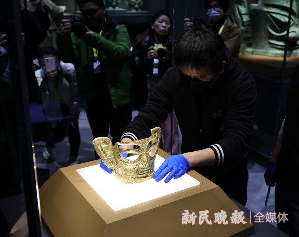 2024年1月29日上午,在新落成的上海博物馆东馆,来自三星堆的文物——黄金面具被移入展柜。上海博物馆东馆部分展厅将于2月2日试开馆,开幕展览为“星耀中国:三星堆·金沙古蜀文明展”。