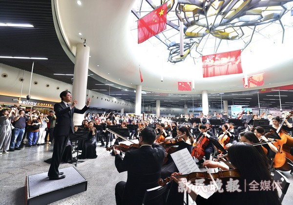 2024年5月26日,上海爱乐乐团在地铁人民广场站玉兰花穹顶下的中央展台,为市民和中外游客奉上特别演出——管弦乐序曲《红旗颂》。这场由张亮挥棒、70人编制的大乐队演奏,也是迄今该乐团最大规模的“快闪”。