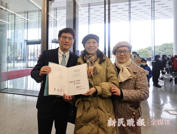 2024年2月2日中午12时,上海博物馆东馆迎来第一名观众诸晓蕾(中)。