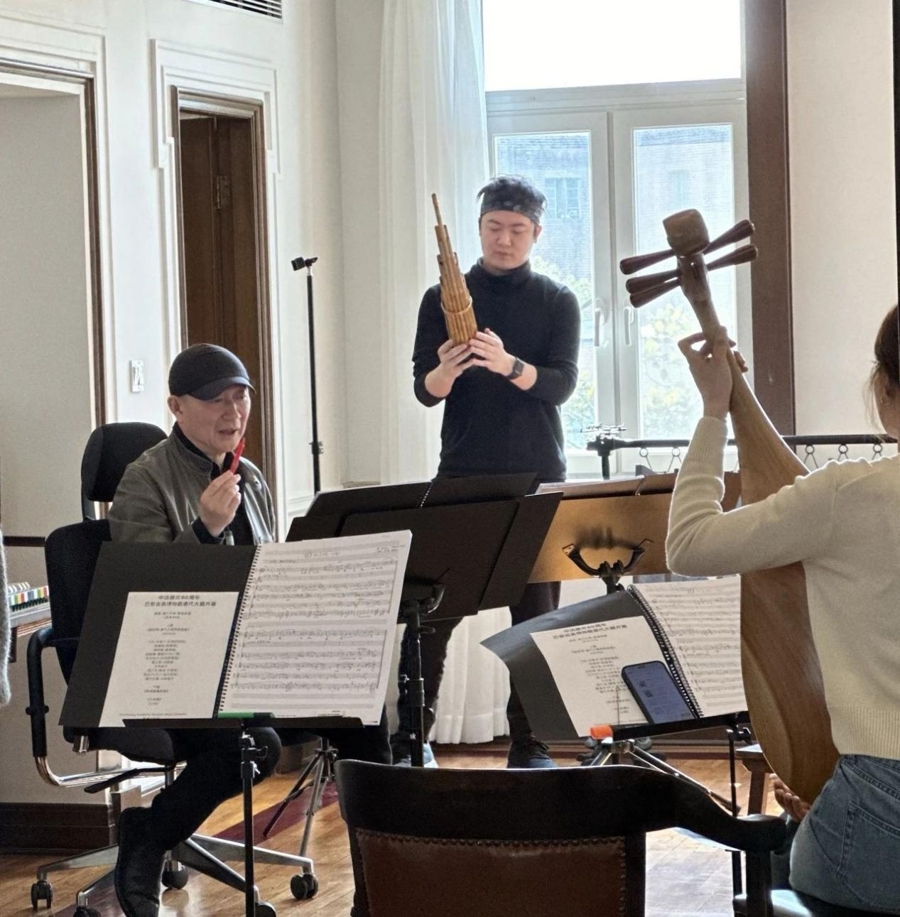 谭盾与敦煌古乐团成员们在一起研究与交流
