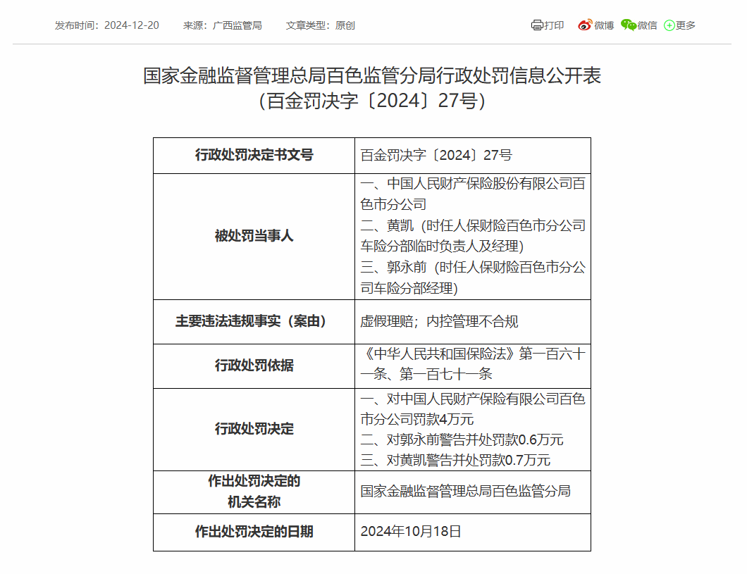 12月20日,据国家金融监督管理总局百色监管分局行政处罚信息披露,中国人民财产保险股份有限公司百色市分公司,因虚假理赔;内控管理不合规,被罚款4万元。