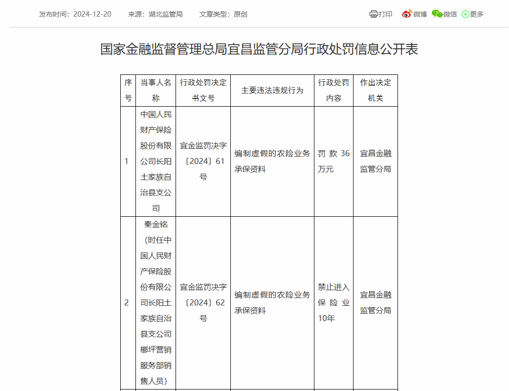 12月20日,据国家金融监督管理总局宜昌监管分局行政处罚信息披露,中国人民财产保险股份有限公司长阳土家族自治县支公司,因编制虚假的农险业务承保资料,被罚款36万元。此外,2名员工分别被罚款4万元,1名员工被10年禁入保险行业。