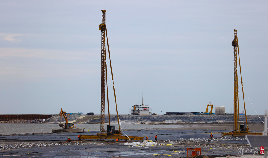 枢纽围堰全长2227.8米,采用“永久南导航堤+东西充砂围堰+北钢板桩围堰”结构形式。合拢后的围堰可有效隔绝外界水流、泥沙,为后续航运枢纽工程主体结构施工提供封闭、稳固的施工环境,枢纽围堰位于大治河入海口。
