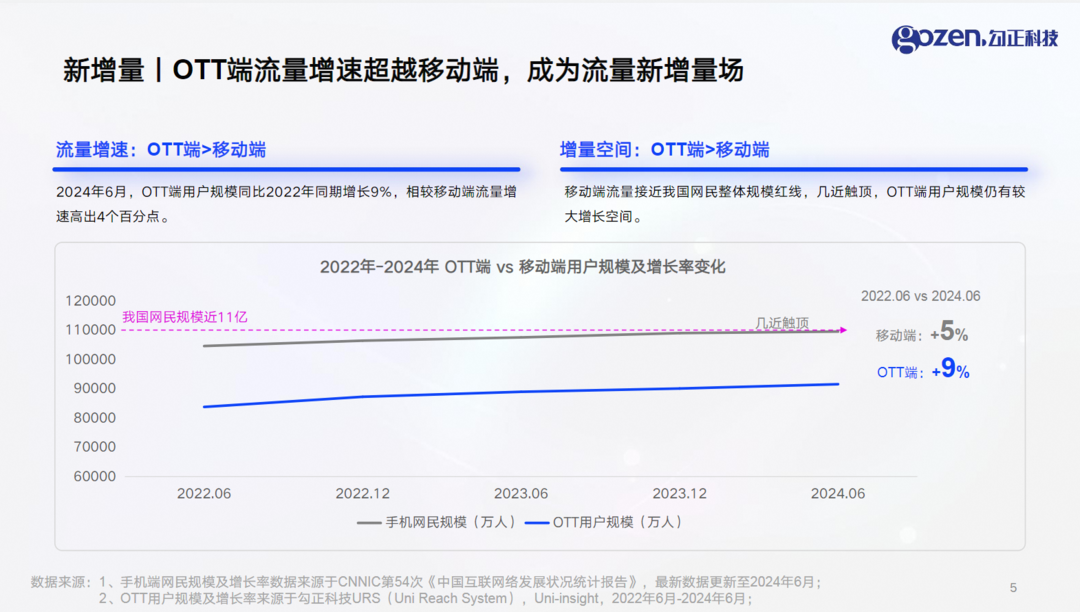 据CNNIC《中国互联网络发展状况统计报告》截至今年6月的最新数据,2022年6月至2024年6月,我国移动端用户规模已接近我国网民整体规模,同比增长5%,OTT端用户规模同比增长9%,为移动端增速的近2倍,增长空间巨大。