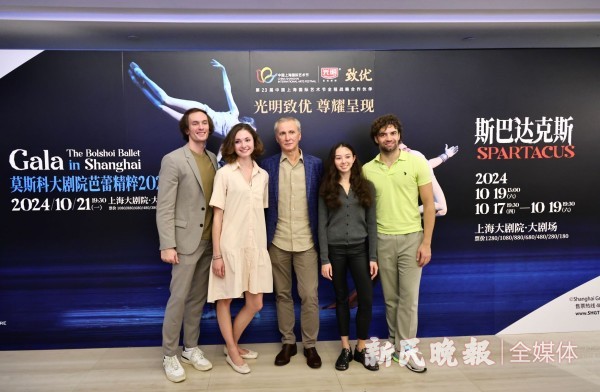 10月16日下午,莫斯科大剧院芭蕾舞团在上海大剧院举行了新闻发布会,演员和舞团艺术总监马哈尔·瓦泽耶夫在海报前合影。他们带来的舞剧《斯巴达克斯》是该剧团的“看家之作”。