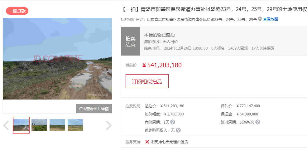 12月25日,据京东资产拍卖网披露的信息,“青岛市即墨区温泉街道办事处凤岛路23号,24号,25号,29号的土地使用权”已流拍,流拍的原因是无人出价,标的物起拍价约5.41亿元,评估价约7.73亿元,起拍价约为评估价的7折。该拍卖吸引了3469人围观,但无人报名参与竞拍。
