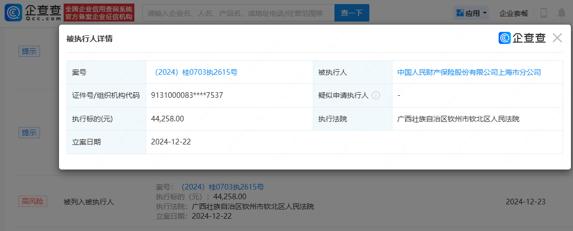 据企查查披露,中国人民财产保险股份有限公司上海市分公司被列为被执行人,执行标的44258元。
