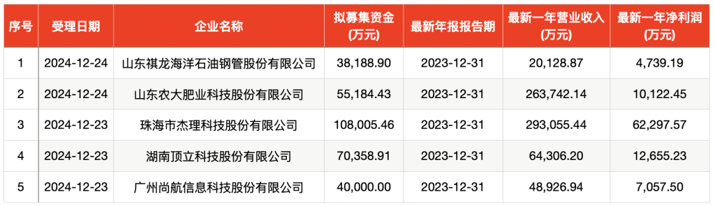 北交所过去两日受理的5家企业包括珠海市杰理科技股份有限公司(简称“杰理科技”)、湖南顶立科技股份有限公司(简称“顶立科技”)、广州尚航信息科技股份有限公司(简称“尚航科技”)、山东祺龙海洋石油钢管股份有限公司(简称“祺龙海洋”)、山东农大肥业科技股份有限公司(简称“农大科技”)。其中,杰理科技拟首发募资超10亿元,有望成为北交所年内最大IPO。