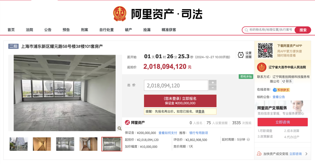 12月26日,澎湃新闻在阿里巴巴司法拍卖网络平台看到,上海市浦东新区耀元路58号楼3#楼101套房产,将于12月27日以20.18亿元进行第二次拍卖。资产处置单位为辽宁省大连市中级人民法院。
