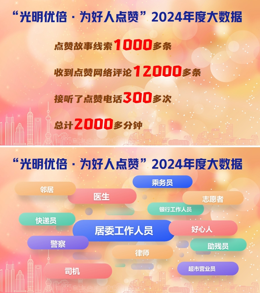 年度大数据显示,截至12月24日,“为好人点赞”项目共收到点赞故事线索1000多条,收到点赞网络评论12000多条。《直通990》节目接听点赞电话300多次,总计2000多分钟,暖流通过一个个故事,传递到城市的每一个角落。