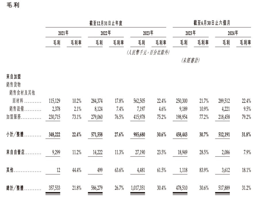近年来,沪上阿姨的毛利率逐年上升。2021年至2023年以及2024年上半年分别为21.8%、26.7%、30.4%以及31.2%。今年上半年毛利率继续提升,主要由于有效的成本控制措施。招股书指出,包括因采购量增加提高议价能力,并与供应商就优惠价格进行磋商以及优化生产流程及供应链管理,从而使加盟业务的毛利率上升。