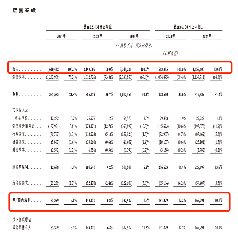 盈利水平方面,2021年至2023年,期内利润分别为8339.9万元、1.49亿元和3.88亿元;2024年上半年利润为1.68亿元,2023年同期为1.91亿元,同比下滑12.3%。2024年上半年经调整利润为2.14亿元,去年同期为1.94亿元。