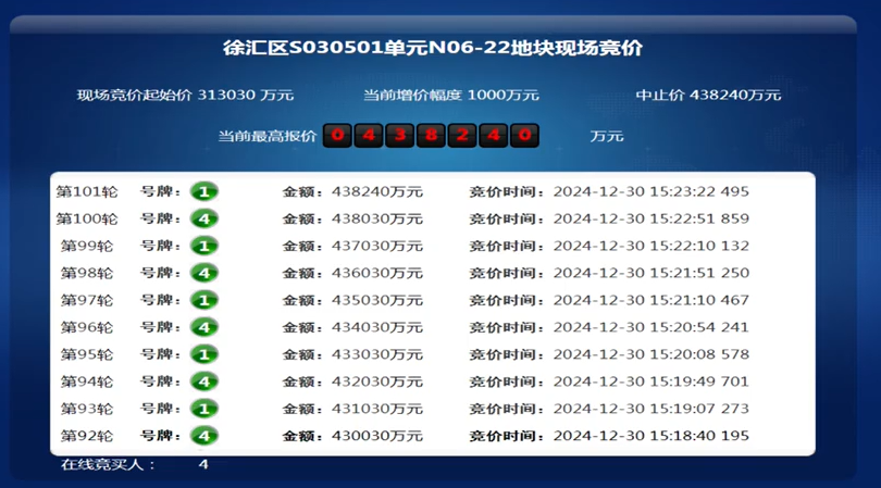 12月30日,上海第八批集中出让地块竞拍首日,徐汇区S030501单元N06-22地块吸引4位竞买人参与现场竞拍,经过101轮竞价触及中止价,两位竞买人同意参与竞“高品质建设”指标环节。