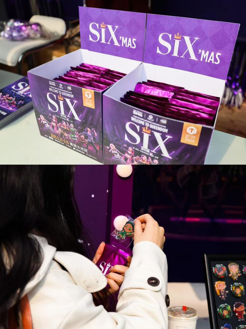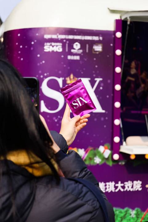 11月起,《SIX》进行多场跨界联动。辞旧迎新之际,《SIX》将庆典搬进中信泰富广场:一辆SIX主题快闪车闪耀登场,为购票观众送出惊喜冰箱贴盲袋,作为年末回馈。活动持续三天,第一天起,快闪车就收获爆棚的人气,日均超过千名观众到场打卡,甚至有观众特意从江苏坐高铁前来兑换。由于其创新的题材和形式、蹦迪般的轻松氛围,《SIX》受众相较传统音乐剧而言更加年轻,有许多观众是在校生,因此新年主题活动也让粉丝们直呼“音乐剧也有自己的官谷了!”活动最后一天,中信泰富广场内的星巴克将咖啡产品带到快闪车,主动拥抱消费者。