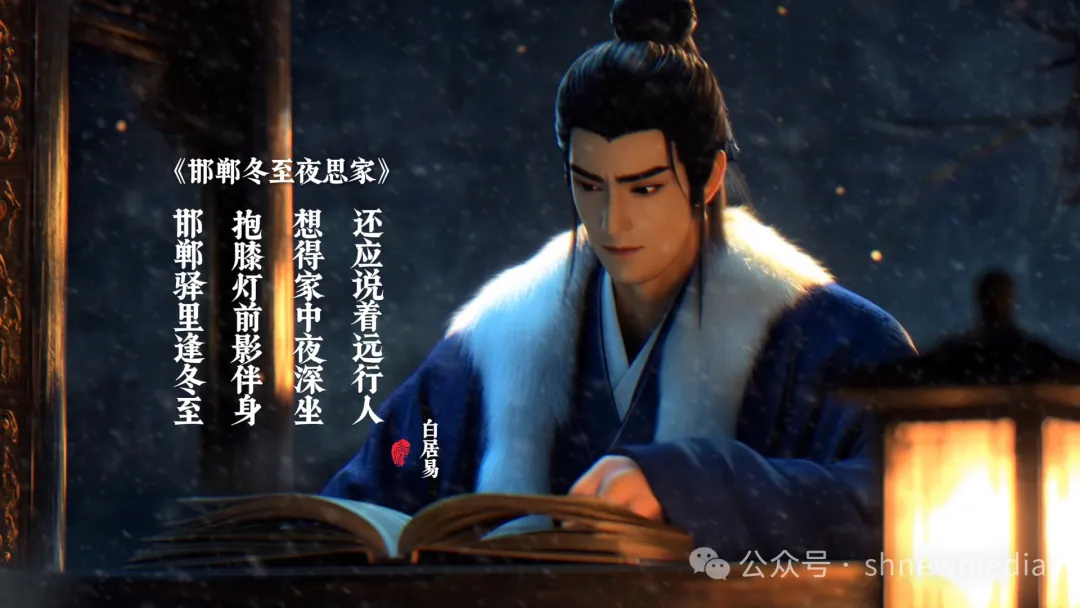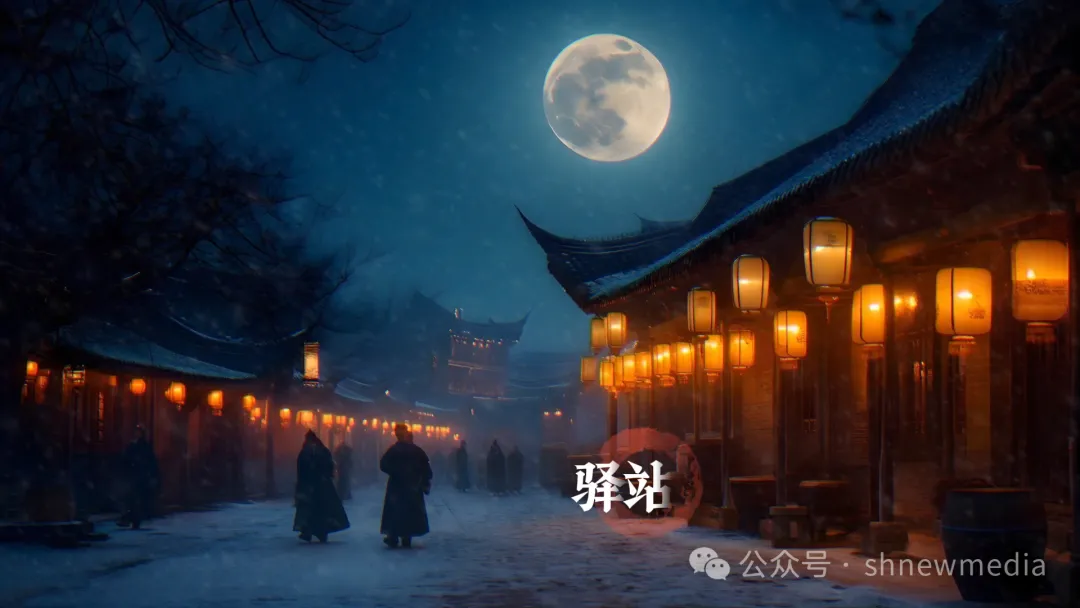 冬至是北半球白昼最短、黑夜最长的一天。天黑得很快,夜晚特别宁静,三人走在街道上,天上飘起了雪。三人走到灯火阑珊处,只见一处驿站内亮着油灯。