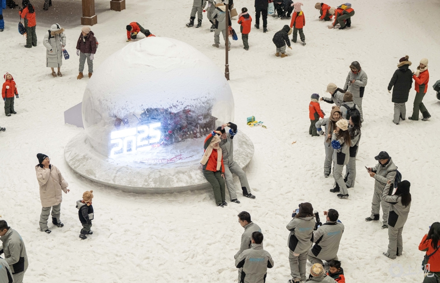 洁白雪花铺满极光小镇、浪漫的2025新年水晶球装置吸引了不少游客留影。