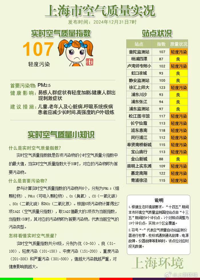 12月31日7时,上海市实时空气质量指数为107,轻度污染,首要污染物为PM2.5,建议儿童、老年人及心脏病、呼吸系统疾病患者应减少长时间、高强度的户外锻炼。
