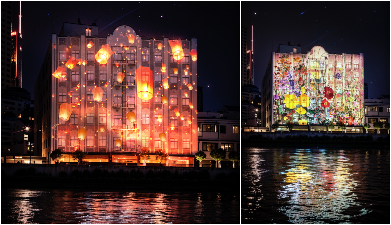 “闪亮・苏河湾”将上演苏河亲水平台光影秀,以苏河亲水平台为核心,以建筑为投影画布,结合世界知名艺术IP与AIGC技术,每周末固定推出《艺术光河》投影秀,将光影画布的可能性无限延伸。