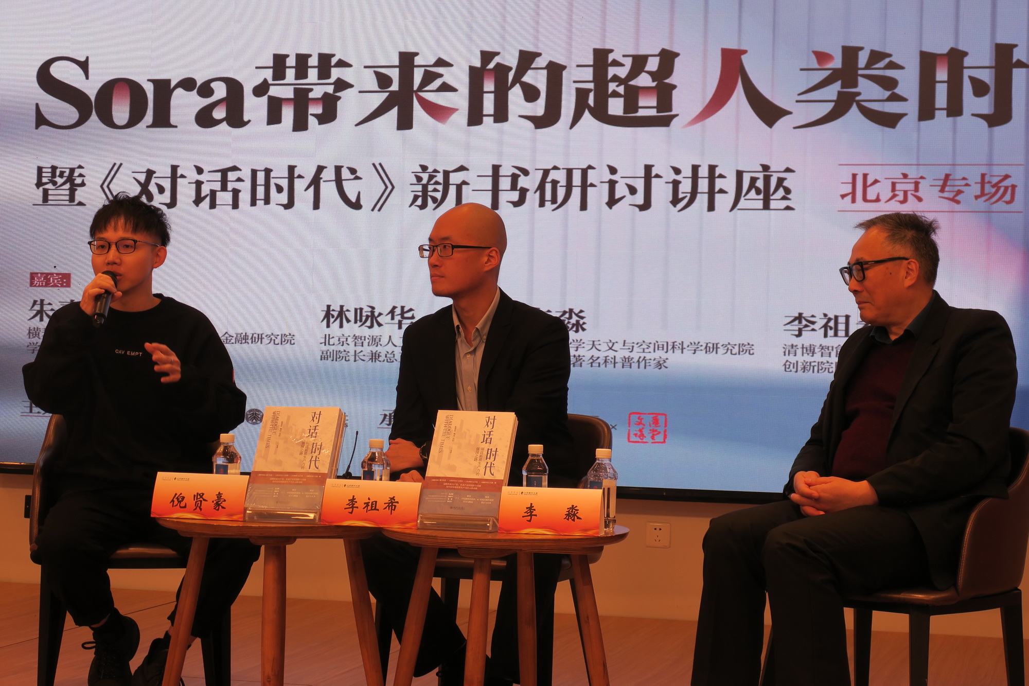 由北京图书大厦、北京大学出版社主办,北大博雅讲坛、文汇讲堂工作室承办的北大博雅讲坛624期“Sora带来的超人类时空感知暨《对话时代》新书研讨讲座(北京专场)”现场,嘉宾观点同中有异