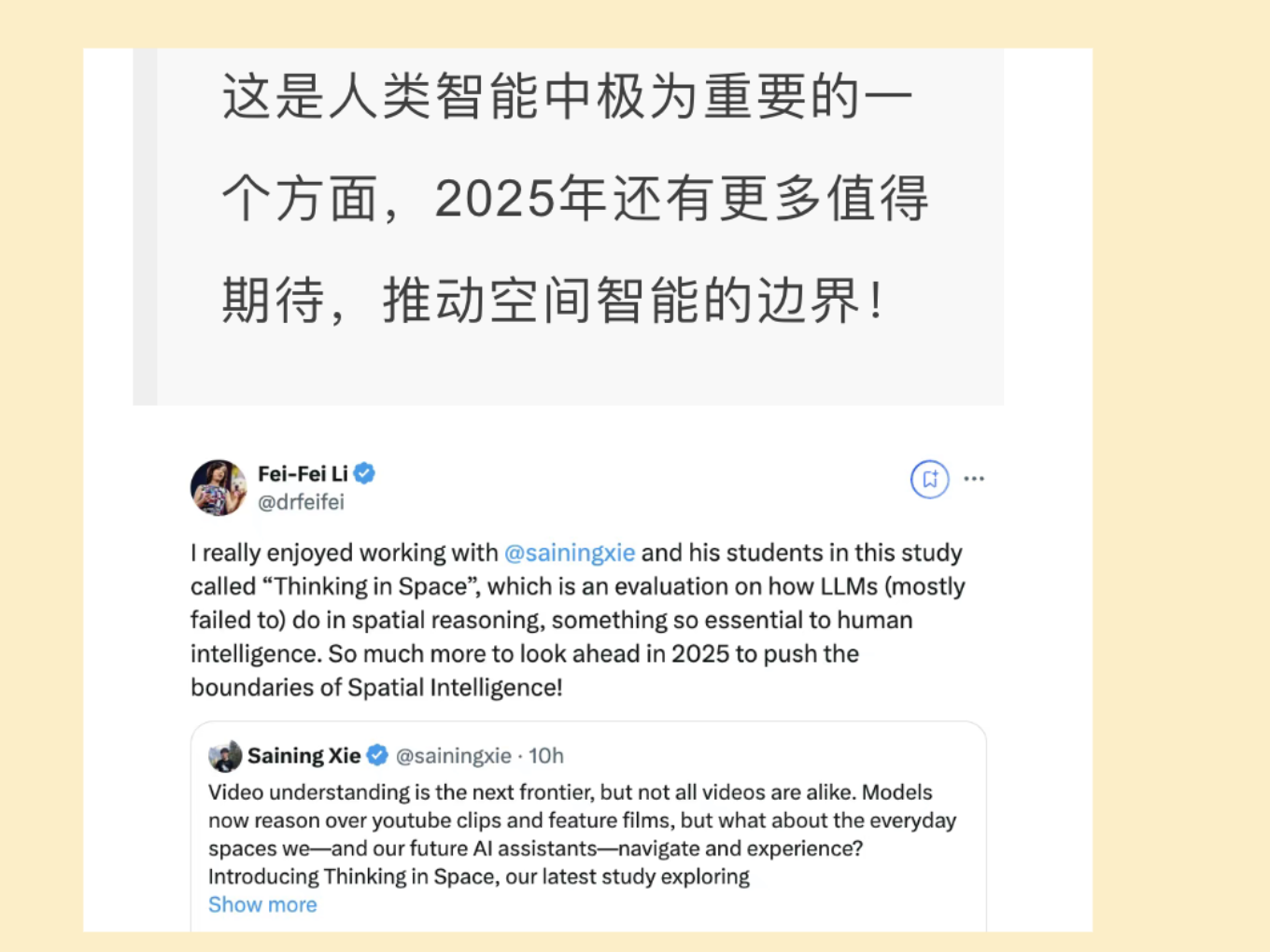 12月下旬,李飞飞、谢赛宁发文正在全力推进空间智能对边界的感知 图源:量子位