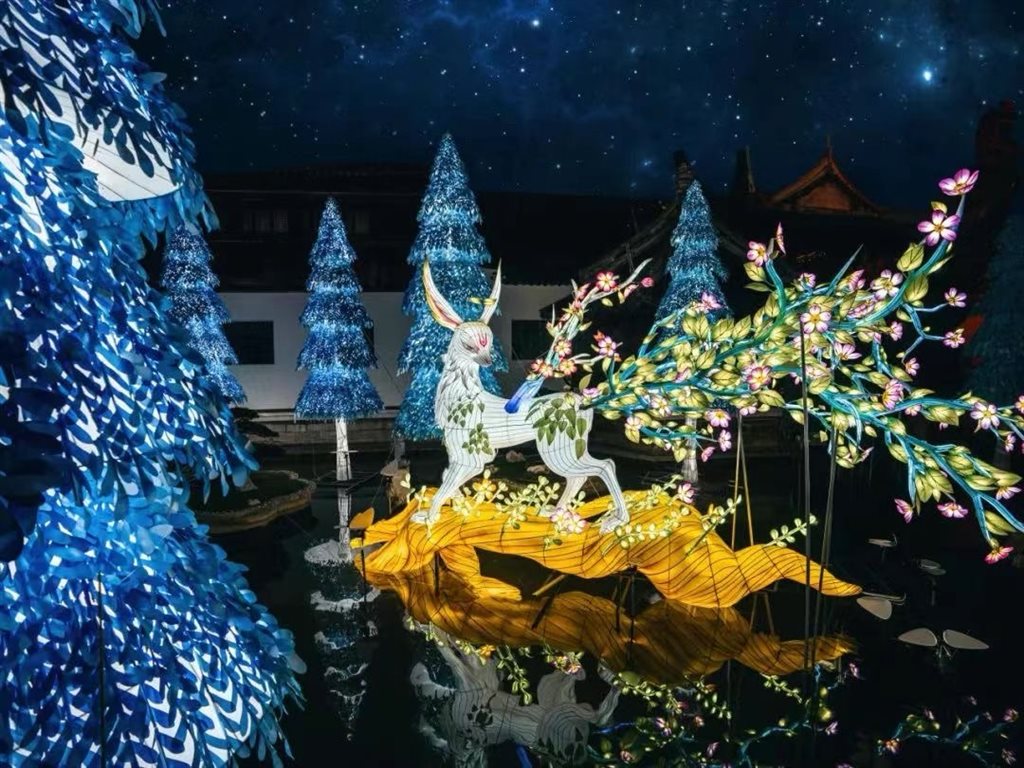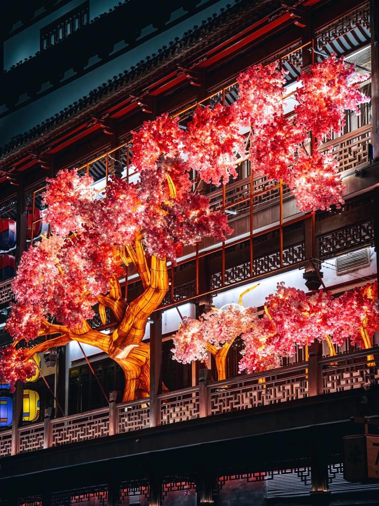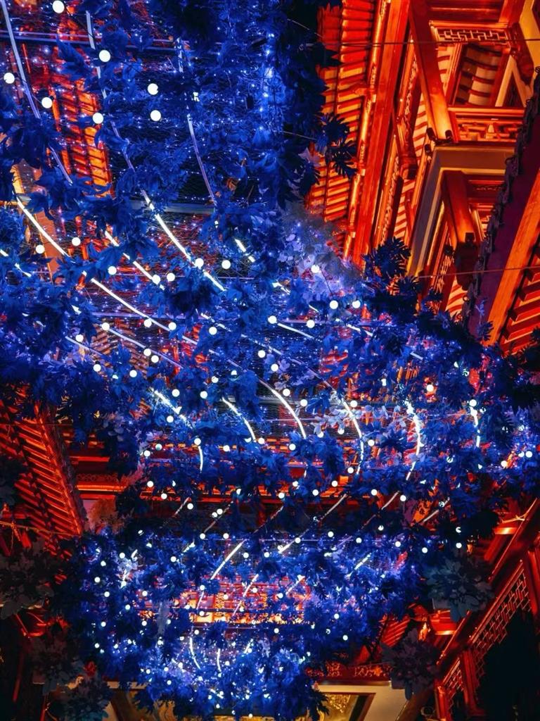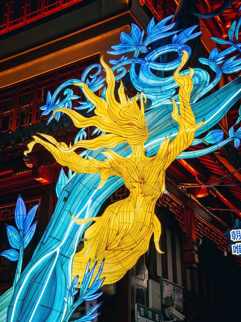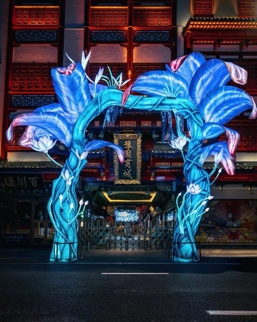 九曲桥上,潺潺的流水声和生灵的鸣叫交织出生命的旋律,丛林氛围弥漫青草香和花香,展现一幅绚丽而生机勃勃的画卷。豫园老街展现豫园灯会30年的灯彩历程,从中国十大灯彩流派中,选其经典造型精细还原,营造出“花市灯如昼”的沉浸感。让大家感受传统灯彩在现代化创新中的转变,通过各个流派的灯笼展示,聚焦非遗文化,传达中国灯彩艺术的和合之美。