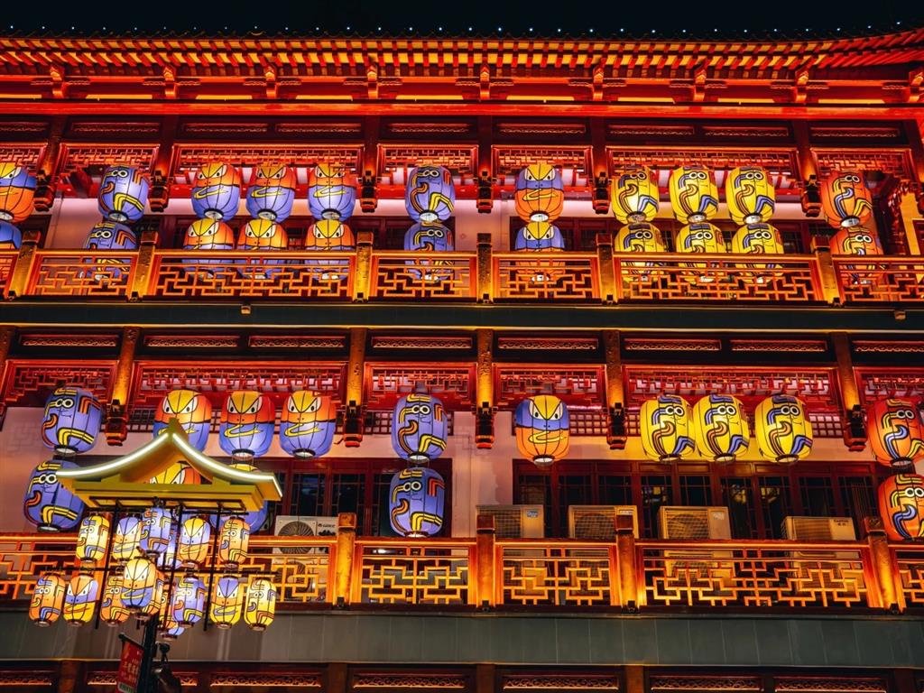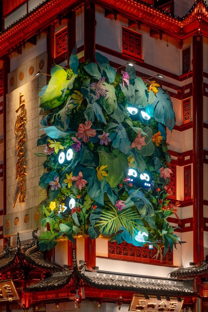 豫园商场外圈,上海老饭店外墙“黑科技”满满,丛林之眼灯组中藏着许多小动物的眼睛,好奇地注视着游人,小动物们的目光,也引发游人的好奇心,引领他们走进灯海丛林探险。旧校场路则被两组可爱又不失传统文化元素风格的灯笼装扮一新,一组以春秋中晚期青铜器上的蛇纹样为基础,一组以京剧脸谱为灵感,传统工艺与现代演绎相得益彰。