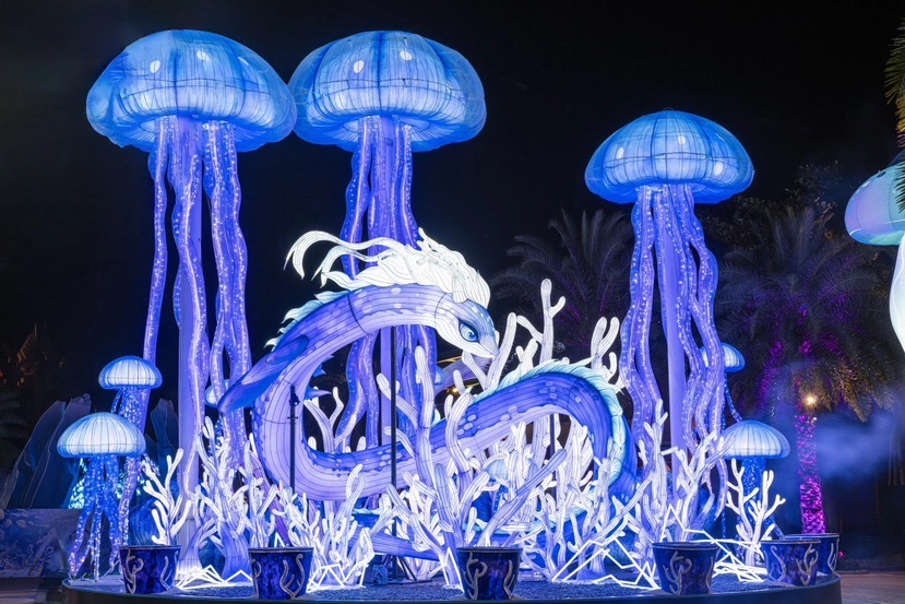 “山海奇妙生机勃发,万物美好不负韶华”中心广场呈现“天地人和,金蛇献瑞”的热闹丛林景象,金色灵蛇盘绕在蘑菇丛林中,灵蛇的身躯仿佛成了一道流动的彩带。豫园股份首席文化官、豫园华灯公司董事长陈佳说,“山海奇豫记·丛林篇”更在意当下人们的审美和时代情绪的共振,关照世间芸芸众生,找寻自己存在的价值与意义。
