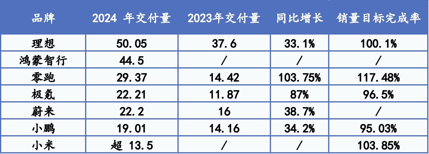 造车新势力2024成绩单:理想年销超50万辆再夺冠,多家超额完成年度销量目标