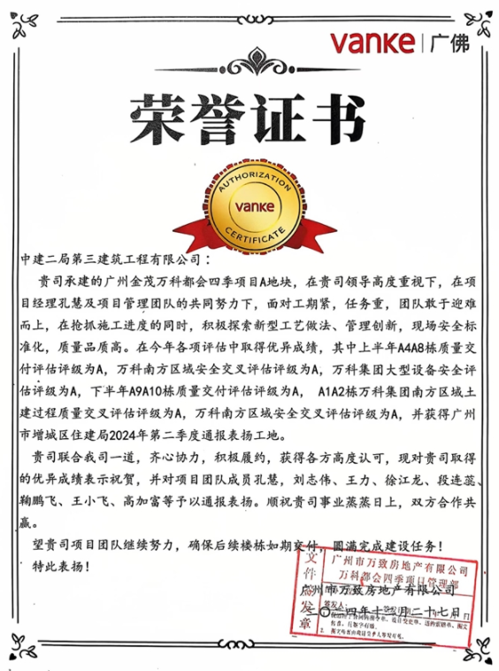 在广州金茂万科都会四季项目A地块的建设中,面对工期紧,任务重,项目经理孔慧带领项目管理人员敢于迎难而上,在抢抓施工进度的同时,积极探索新型工艺做法、管理创新创效,提升现场安全标准化,保证施工质量品质高。在今年业主各项评估中均取得优异成绩,并按期完成交付工作,完美履约,同时还获得广州市增城区建设局2024年第二季度通报表扬工地。