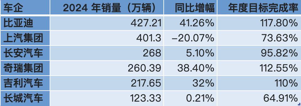 刚迈入2025年,各大车企纷纷抢先发出捷报。2024年,比亚迪、长安、奇瑞、吉利等车企突飞猛进,多个品牌创下年度销量的历史新高。其中,新能源车对销量的拉动尤为凸显。