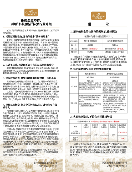 圣吗哪回应,根据国际检测机构SGS的数据,就原料本质与健康影响而言,冰勃朗与植脂末是两种完全不同的食品原料,评测视频以偏概全,采用错误的实验数据,而非实际使用场景来对饮品的工艺定性,存在对消费者的巨大误导。