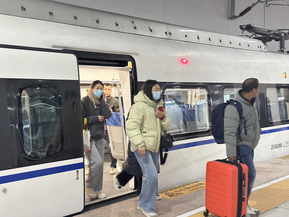 2025年1月5日上午6点43分,随着金山卫发往莘庄的S1602列车停靠在铁路莘庄站站台,标志着上海又一座新火车站——铁路莘庄站正式开通运营。本文图片:闵行区供图