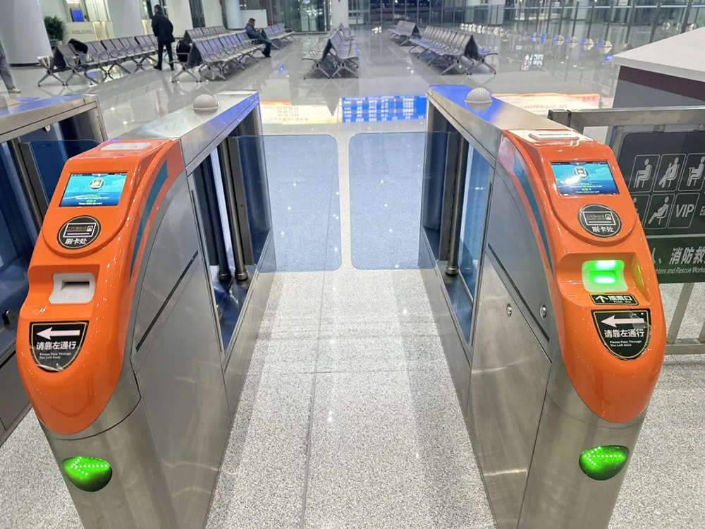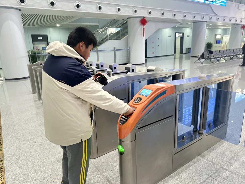 6点43分左右,铁路莘庄站迎来了第一波乘客,大家在工作人员的引导下有序出站。