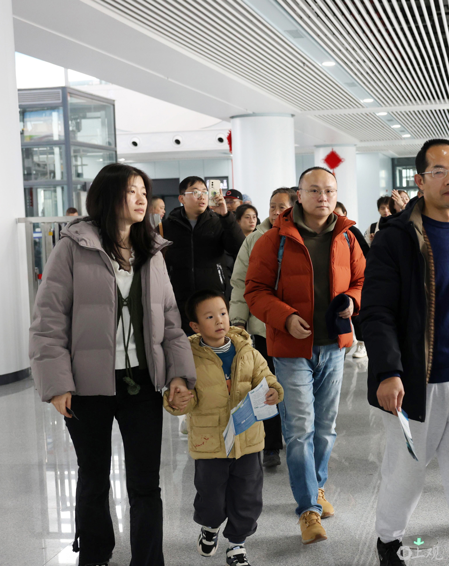 付汝成小朋友一家乘坐S1609次列车从莘庄站前往金山卫站,从候车室到车厢内,他都颇感新奇,妈妈借此给他科普铁路出行知识。