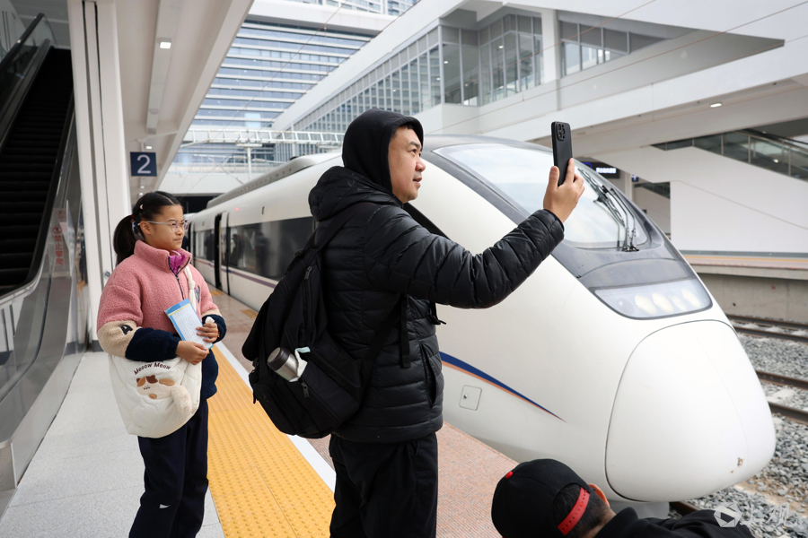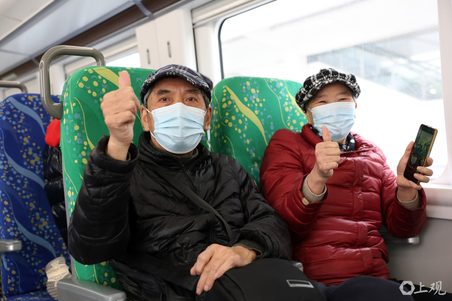 六岁男孩付汝成与家人一起,在莘庄站搭乘金山铁路列车前往金山卫“一日游”。妈妈庞女士介绍,他们家住在莘庄站旁一公里处,目睹着莘庄站从无到有,终于盼来开通,便迫不及待带全家人去游玩,丰富周末生活。