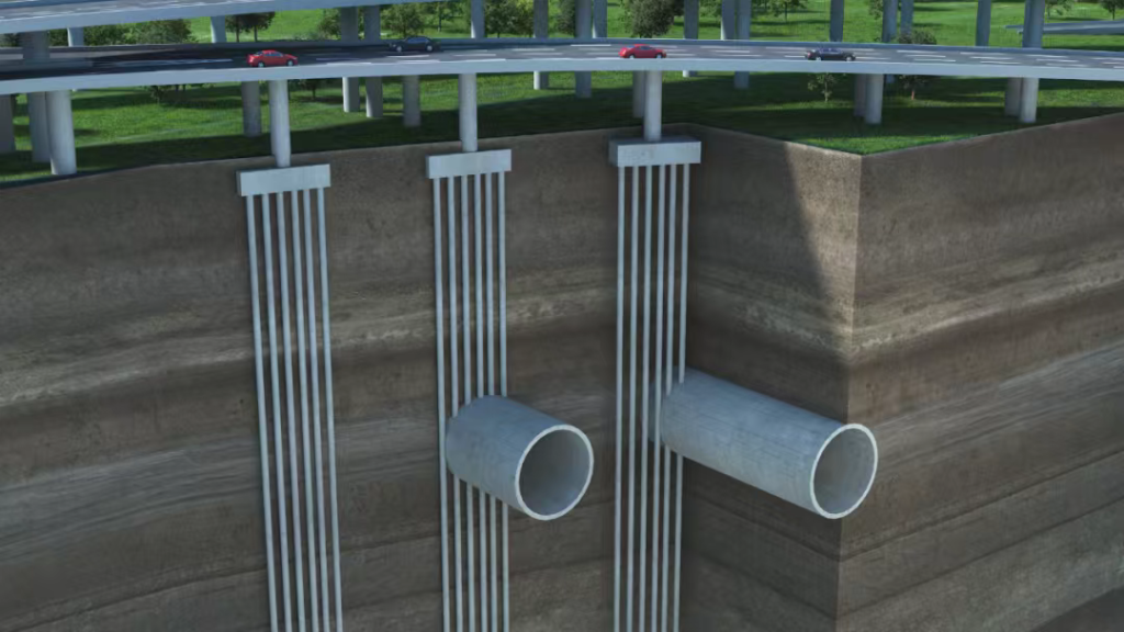 例如,景洪路站是“基坑开挖最深”车站。其下穿15、19号线,车站埋深较深,为地下四层车站,紧邻春申塘、轨道交通15号线区间,车站土方开挖量约为标准地下二层车站的9倍,最大开挖深度达44米,基坑施工涉及⑦层、⑨层承压水。车站围护结构采用1.2米厚地墙,最深107.5米,针对承压水采用“围护-降水一体化”“降水-回灌一体化”“降深、降时最小化”的设计理念,采取“隔、降、灌”综合治理技术,有效控制了承压水施工风险。