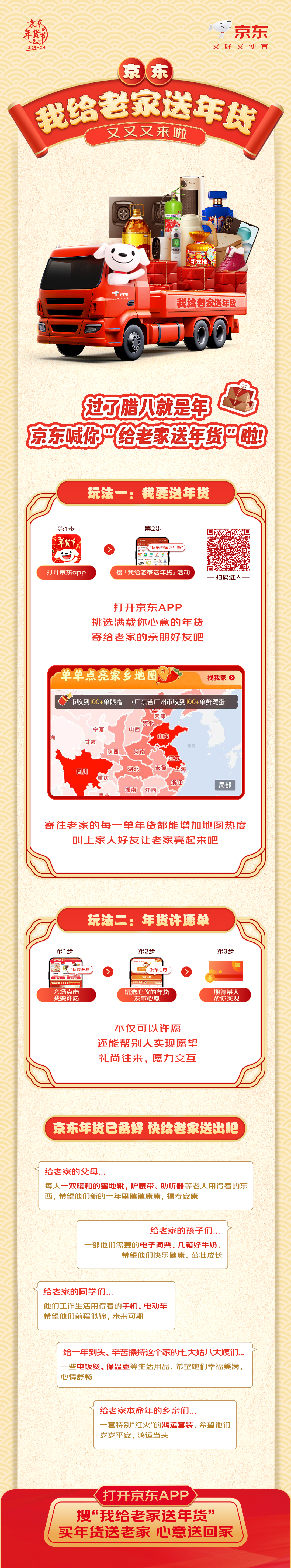 年货送家乡,心意传温暖。即日起打开京东APP,搜索“我给老家送年货”进入活动会场,把新年祝福与年货好物送回家!