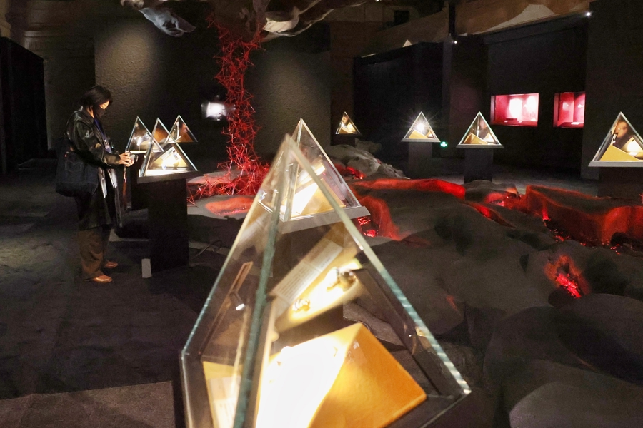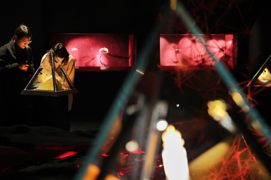 步入拿破仑一世金叶子专属的展厅,能看到由红色和绿色天鹅绒覆盖的帷幕。“流动的盛宴”单元用中国传统非遗漆器描金工艺和数十面镜子打造了一道独特的“镜廊”。最后一个单元是致敬时间的单元,力图呈现宝石在大地上诞生的最初时刻。