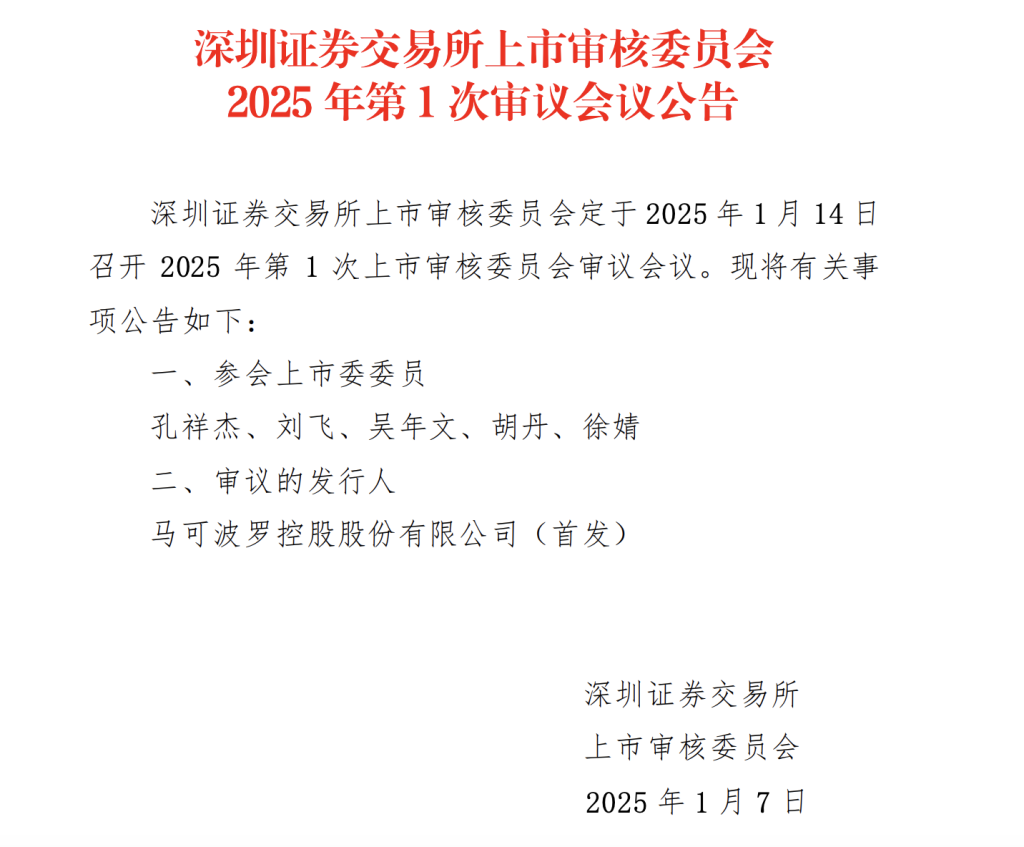 1月8日,据深交所网站消息,深交所上市审核委员会定于2025年1月14日召开2025年第1次上市审核委员会审议会议,届时将审议马可波罗的首发事项。