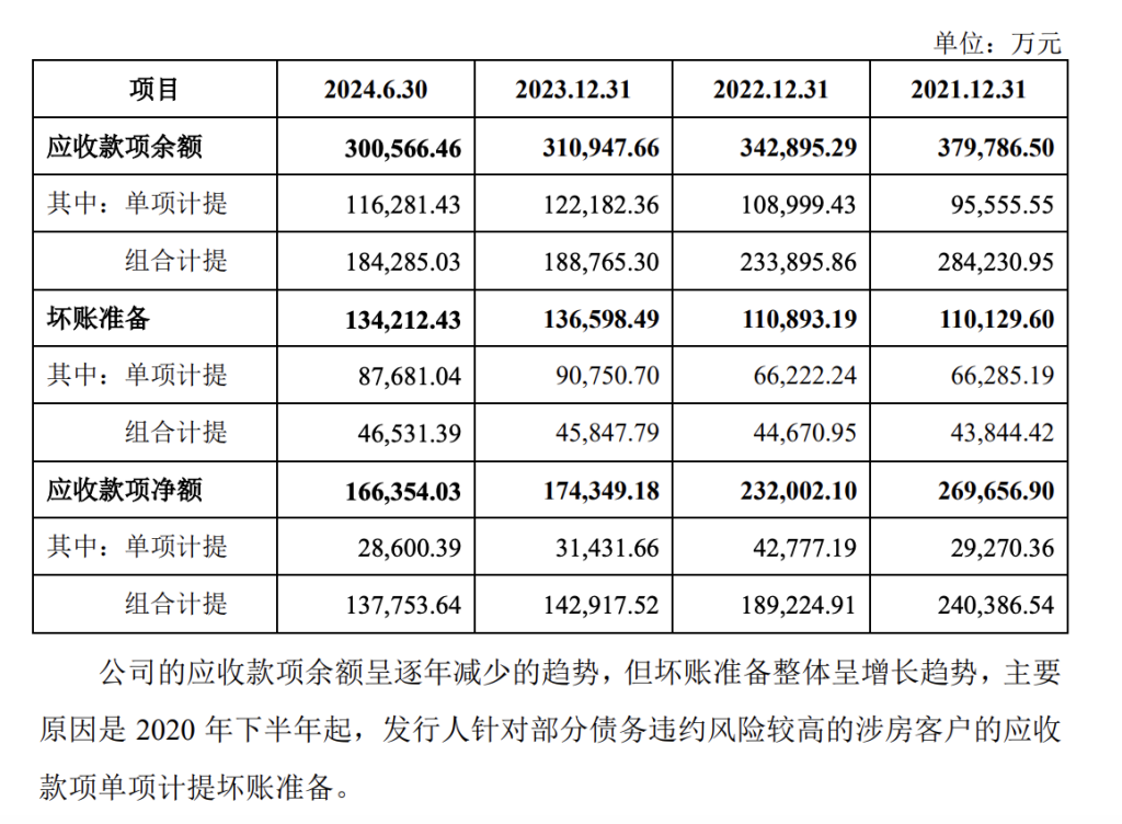 报告期及2024年上半年,马可波罗应收款项余额(含应收账款、应收票据、合同资产、其他应收款等科目)分别为379786.50万元、342895.29万元、310947.66万元及300566.46万元,坏账准备余额分别为110129.60万元、110893.19万元、136598.49万元及134212.43万元。其中涉及单项计提的应收款项余额合计95555.55万元、108999.43万元、122182.36万元和116281.43万元,坏账计提余额66285.19万元、66222.24万元、90750.70万元和87681.04万元。