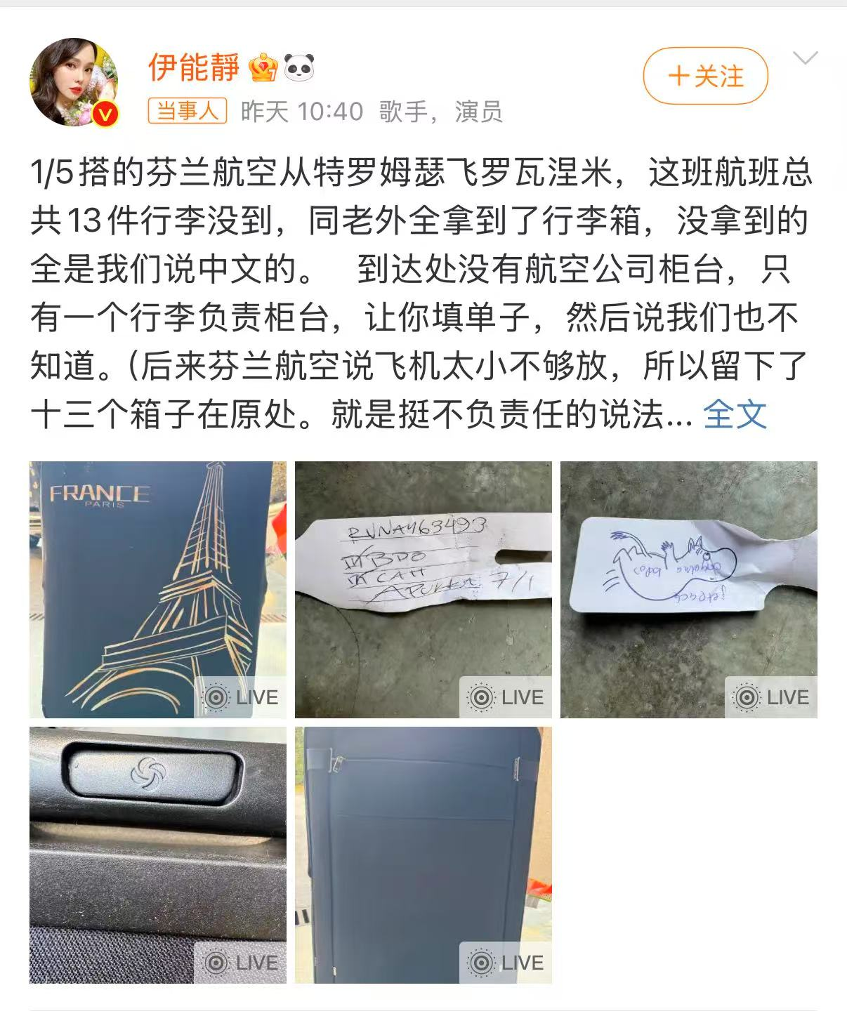 女星伊能静发文称乘飞机丢13件行李,芬兰航空:正积极跟进