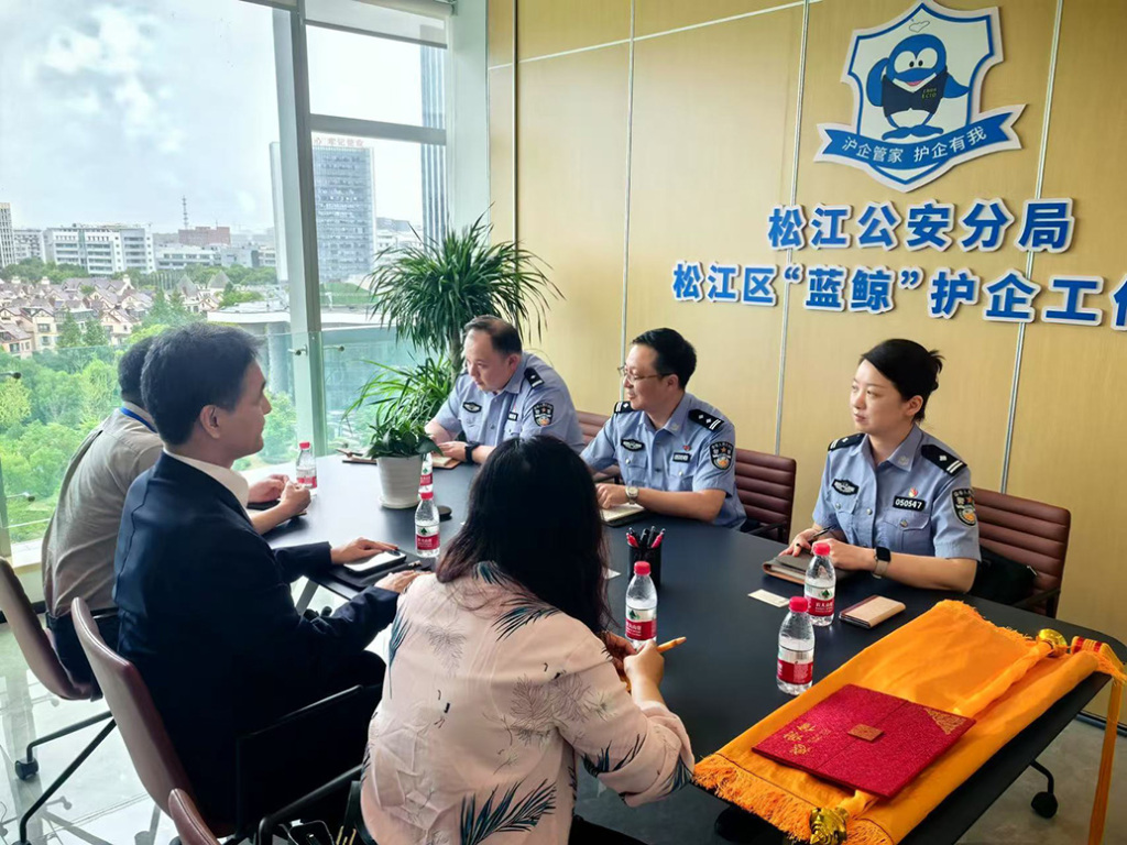 松江公安分局民警依托“蓝鲸”护企工作站为在沪企业开展日常走访、法律援助等服务。